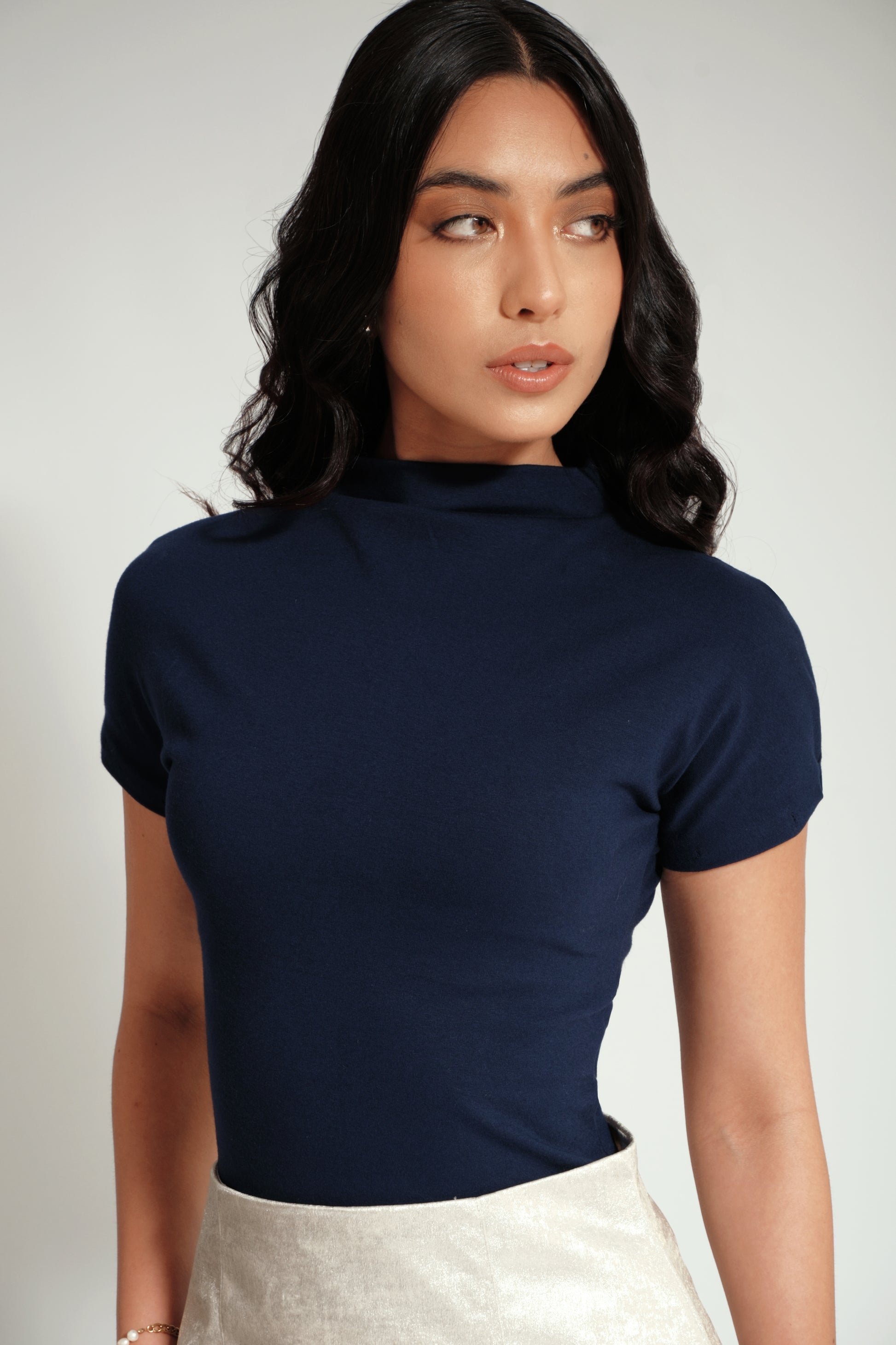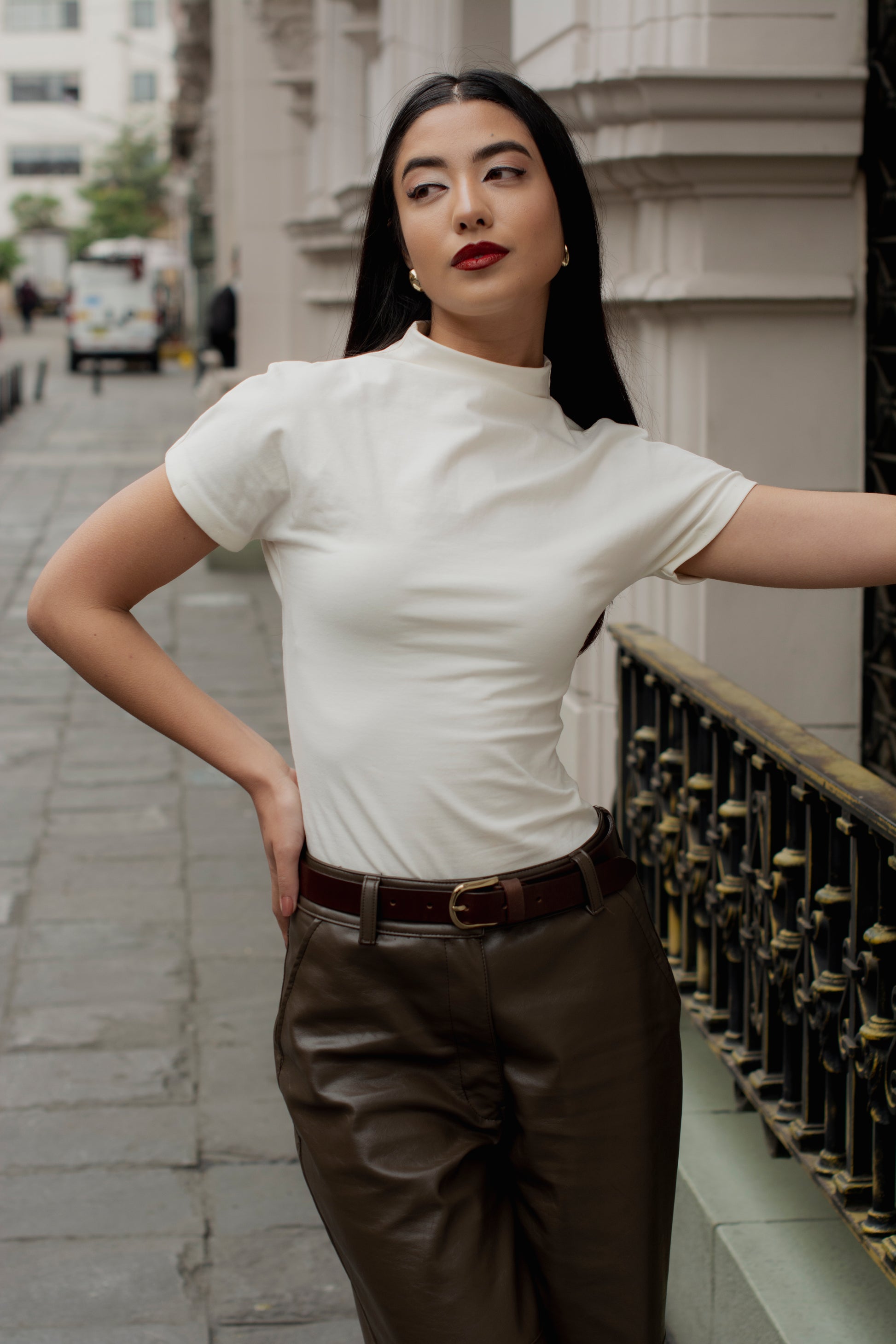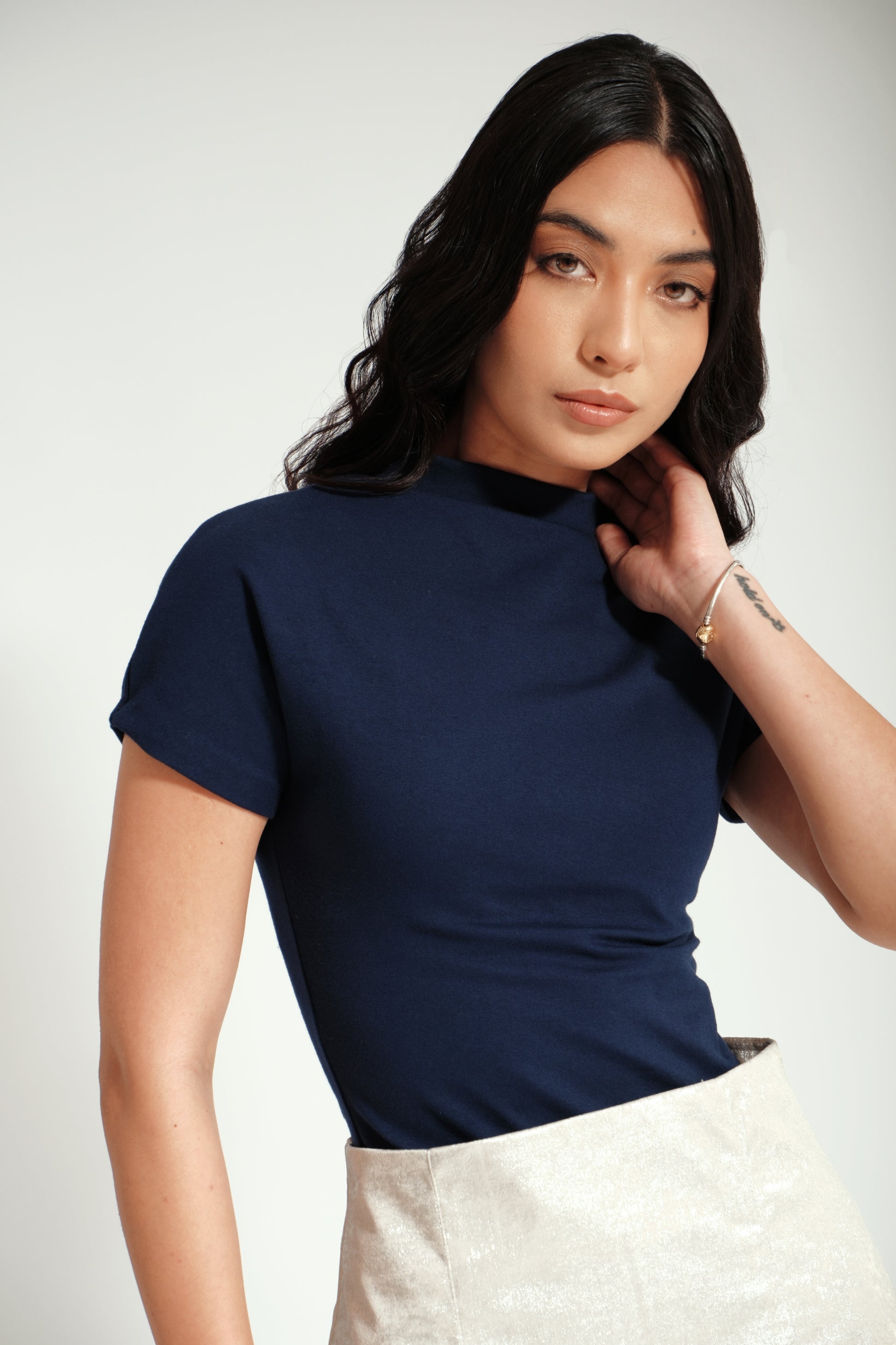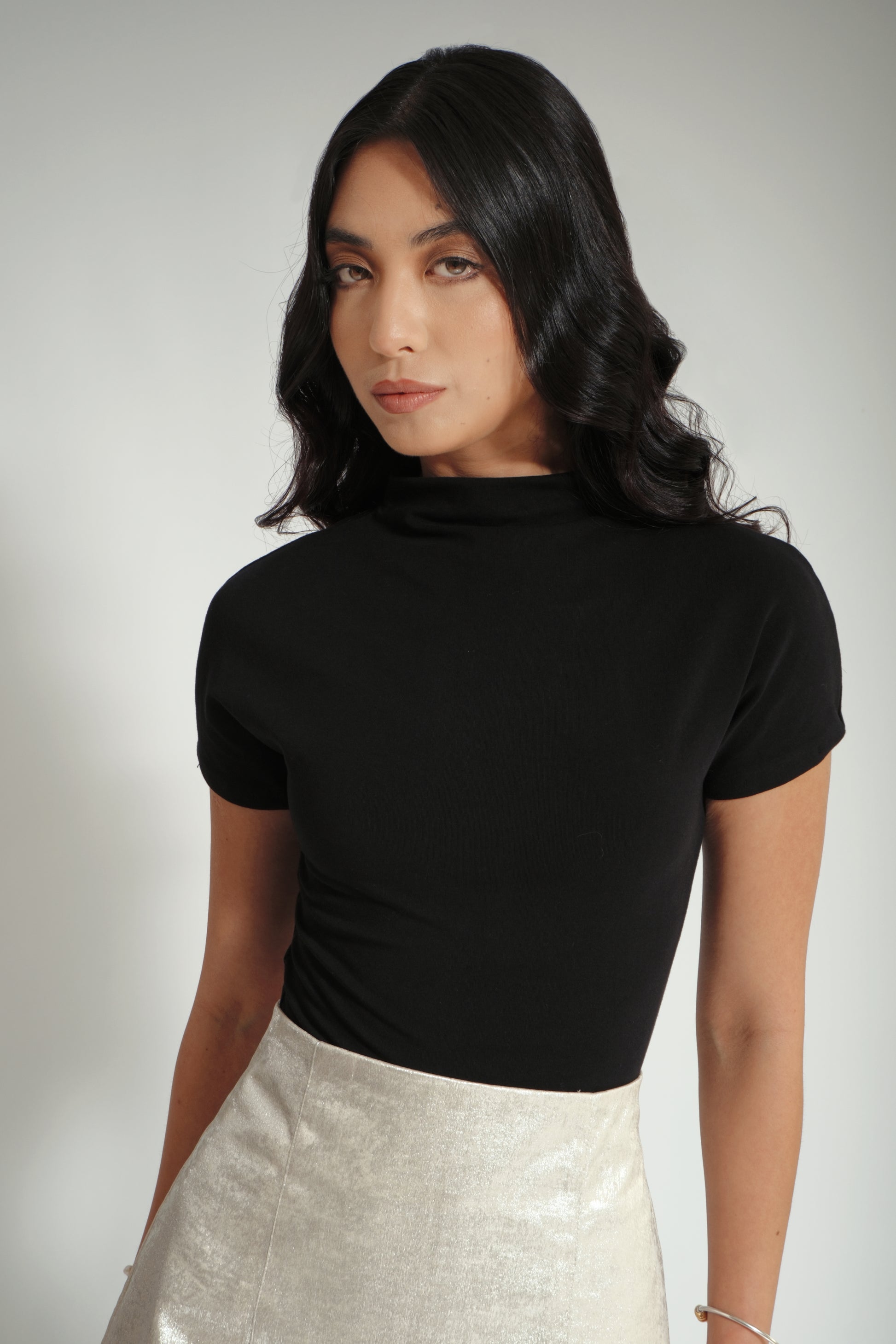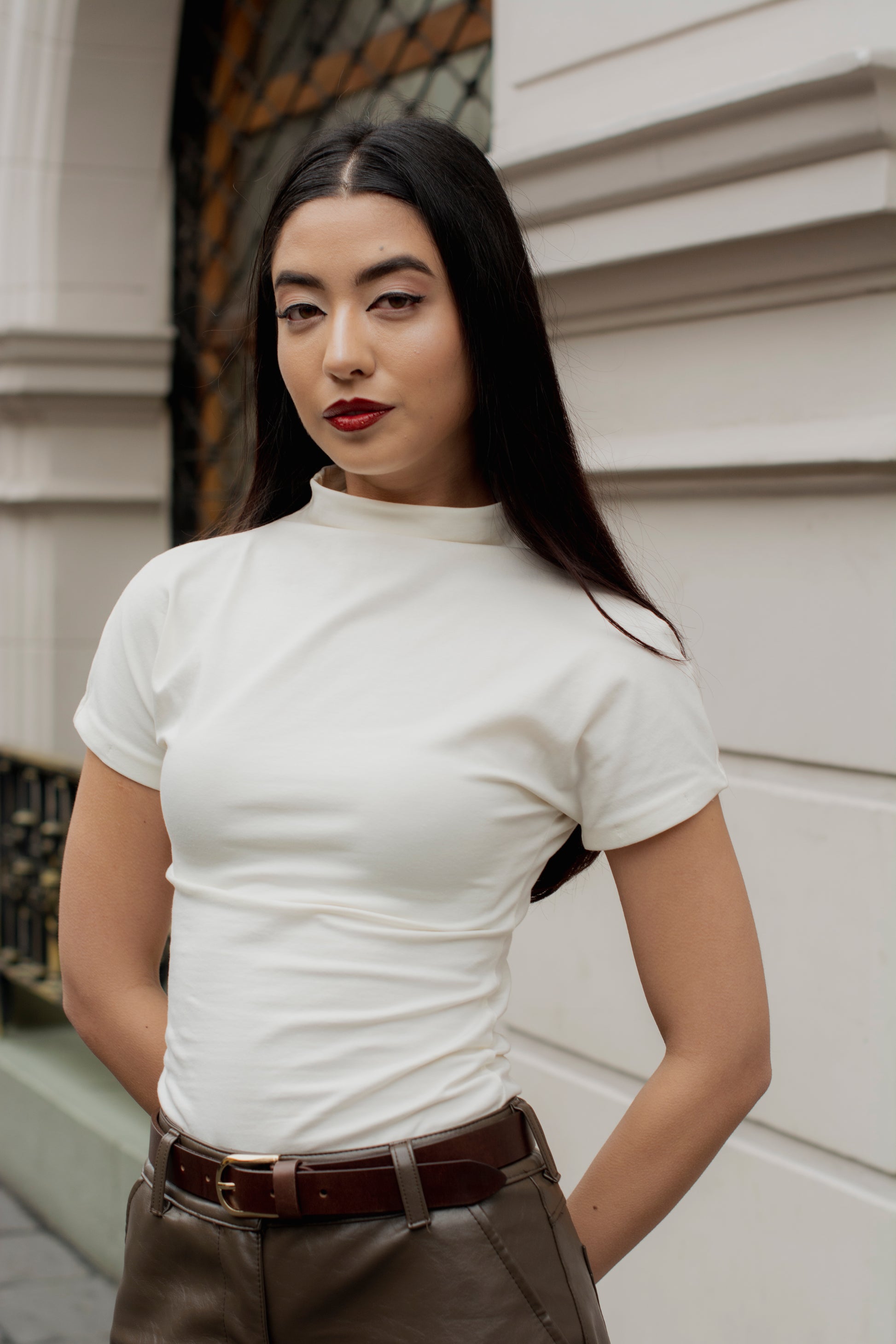 Básico de cuello alto hecho de algodón licrado con corte hasta la cadera.