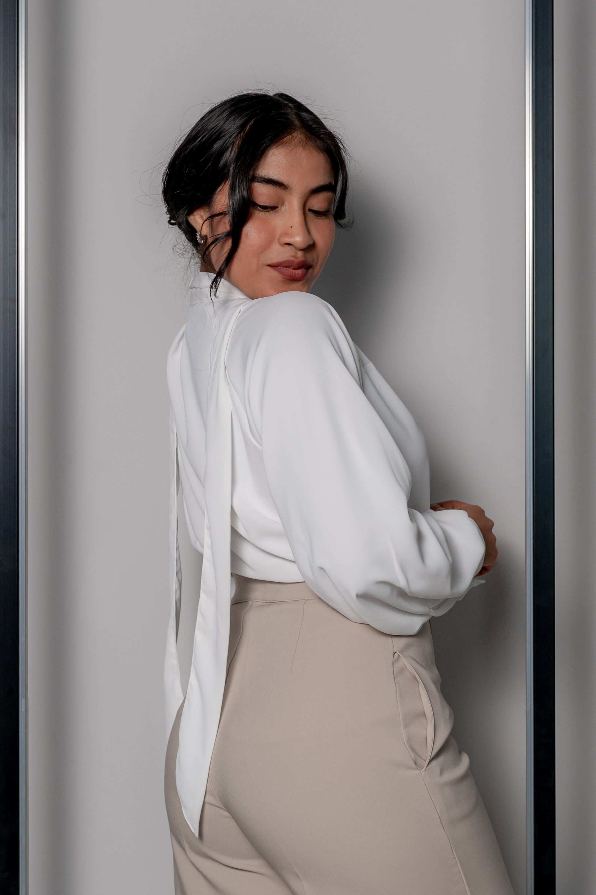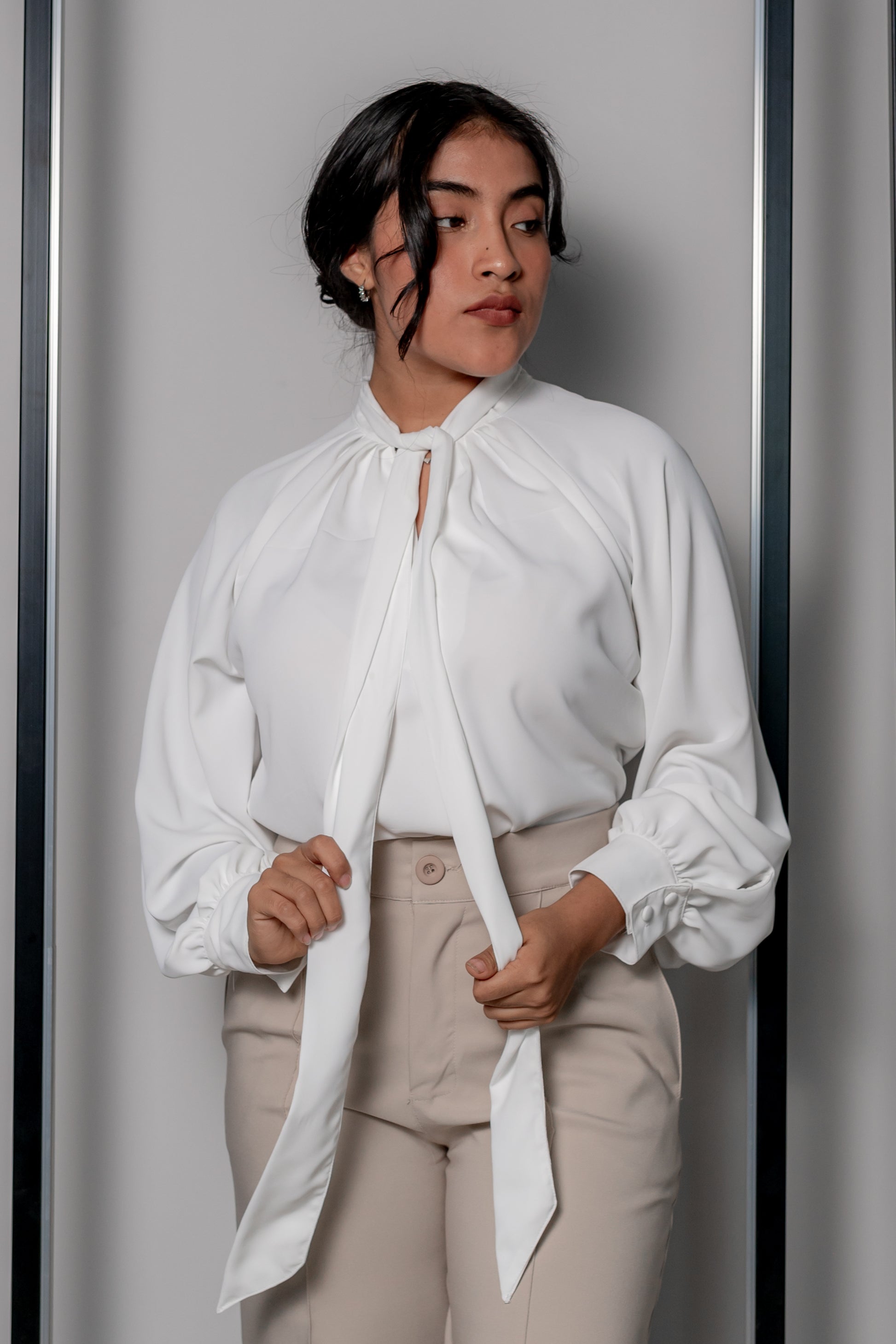 Elaborada en una seda suave, esta blusa con lazo al cuello es puro encanto elevado. Su estilo romántico no es tierno, es imponente. Botones forrados en la manga te da ese estilo romantico para mantener el balance.